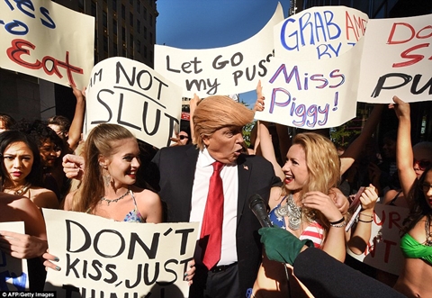 He was accompanied by 12 women holding placards emblazoned with slogans including ‘grab my p*$$y,’ ‘grab America by the p***y’ and ‘so nasty…’ making reference to comments he has made about women. Alison said: ‘It’s a performance with some girls, really who have something to say to Donald Trump because obviously Donald Trump has said a lot of bad things about girls, it’s an opportunity for them to say something back.