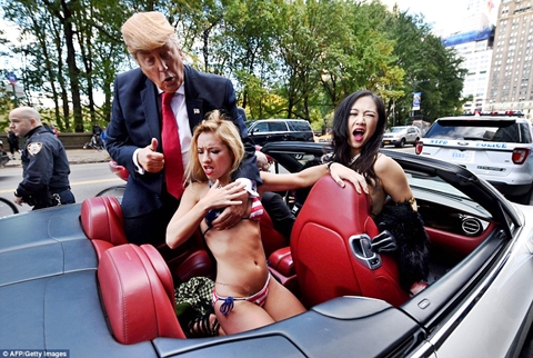 U.S presidential candidate, Donald Trump has been pictured at the iconic Times Square in New York city with topless and bikini-clad babes as he grabs their boobs and privates in public.